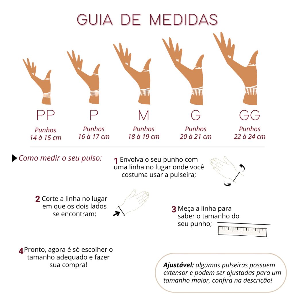 Pulseira: 17 cm de comprimento e extensor de 7,5 cm;